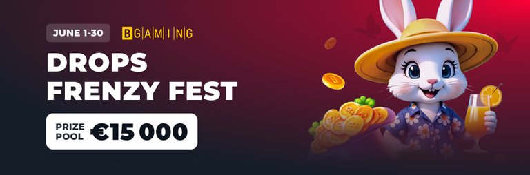 Spin your way to wealth through summer surprises. Join the Drops Frenzy Fest during June to share €15,000! Play BGaming slots and enjoy hot crypto drops.
